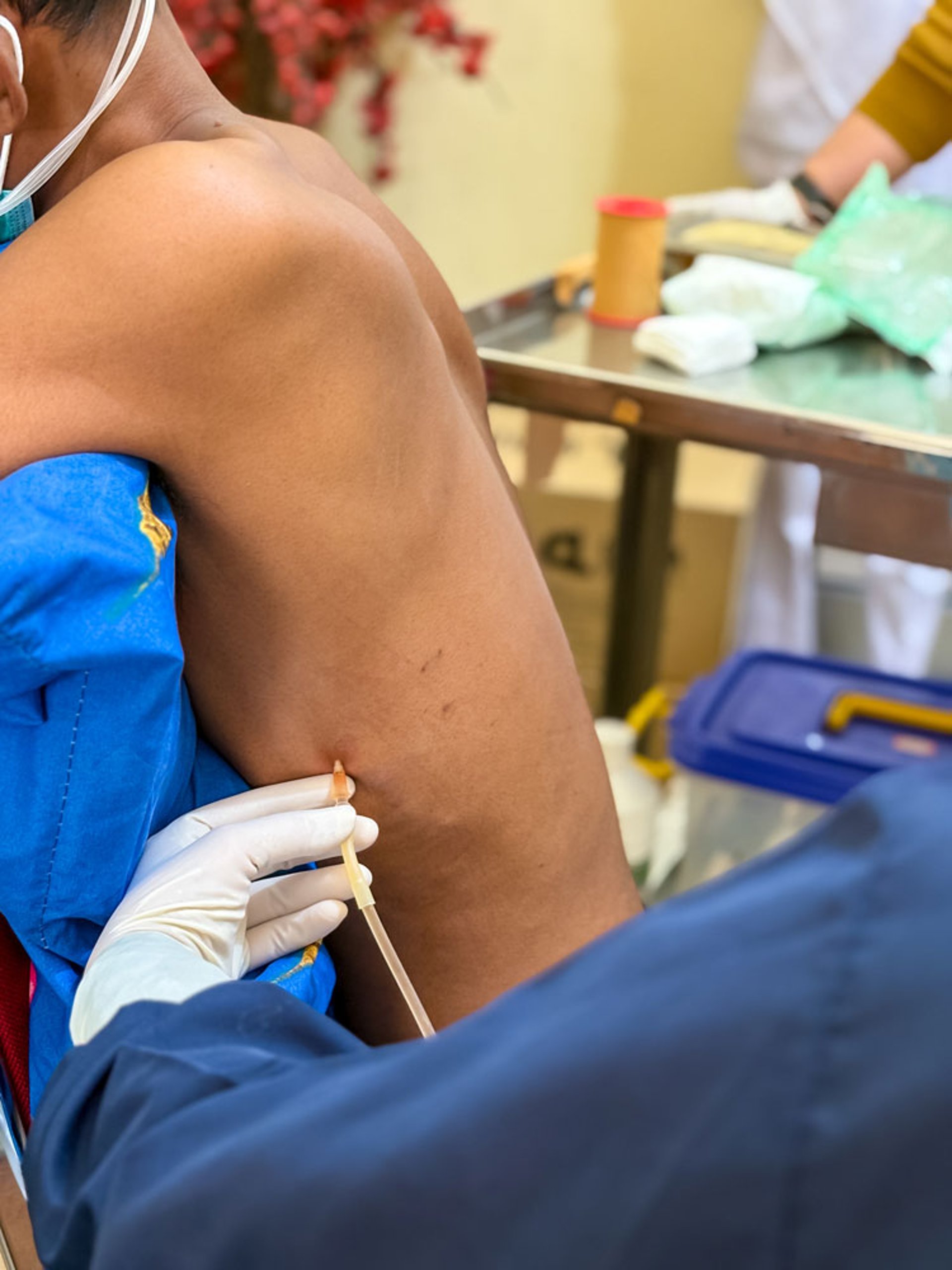 If a large volume of fluid has accumulated, it may need to be removed through a plastic tube and it may be necessary to use a fluid container or bottle that is larger than a syringe. The fluid may need to be drained over several days, in which case a larger tube (chest tube or drainage catheter) is left in the chest and suctioned continuously.