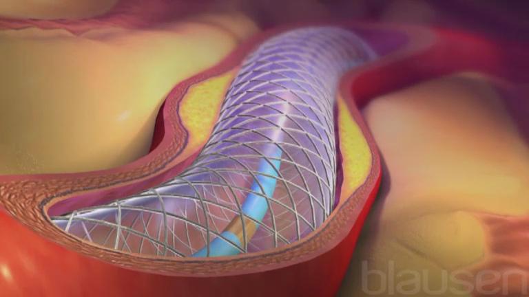 Oftentimes during angioplasty, a stent is inserted at the site of the blockage to help the artery from re-closing. A stent is a wire mesh tube placed around the deflated balloon catheter. When the catheter is guided to the blockage site and is inflated, the stent expands and adheres to the artery wall. The catheter and guide wire are then removed and the stent remains in place.