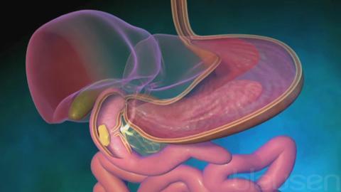 Mastication, or the chewing of food in the mouth, is the first step of digestion. Saliva initiates digestion and changes the chewed food into a soft mass, or bolus. Saliva makes the bolus slippery, making it easier to be swallowed and slide down the back of the throat and esophagus. The bolus passes through the esophageal sphincter before it enters the stomach. Inside the stomach, hydrochloric acid is released, breaking down large food molecules into smaller ones and liquefying the bolus. The liquefied bolus, now called chyme, then passes through the pyloric sphincter and enters the duodenum, the first section of the small intestine. It is here that enzymes released from the pancreas, liver, and gallbladder further breakdown chyme into elements that can be easily absorbed and used by the body.