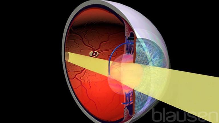 Durante la visión normal, la luz atraviesa la córnea, la cubierta transparente del ojo, y luego atraviesa la pupila, que en realidad es un orificio ubicado en la parte coloreada del ojo, o iris.