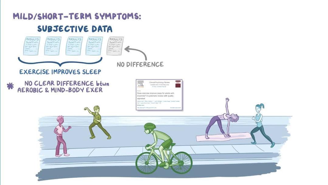 To answer this question researchers looked at a number of studies that explored the link between exercise and symptoms of insomnia or insomnia disorder. They specifically looked at randomised clinical trials, where at least 30 minutes of either aerobic exercise, like cycling, or mind-body exercise, like yoga or Tai chi, were done per session, for at least 120 total minutes a week for several weeks, to see if that improved overall sleep in adults with insomnia. To measure sleep quality, the studies either used subjective data, like questionnaires and diaries or objective data, like actigraphy, which measures body movement through the night, or polysomnography, which measures brain waves, heart rate, and breathing through the night.