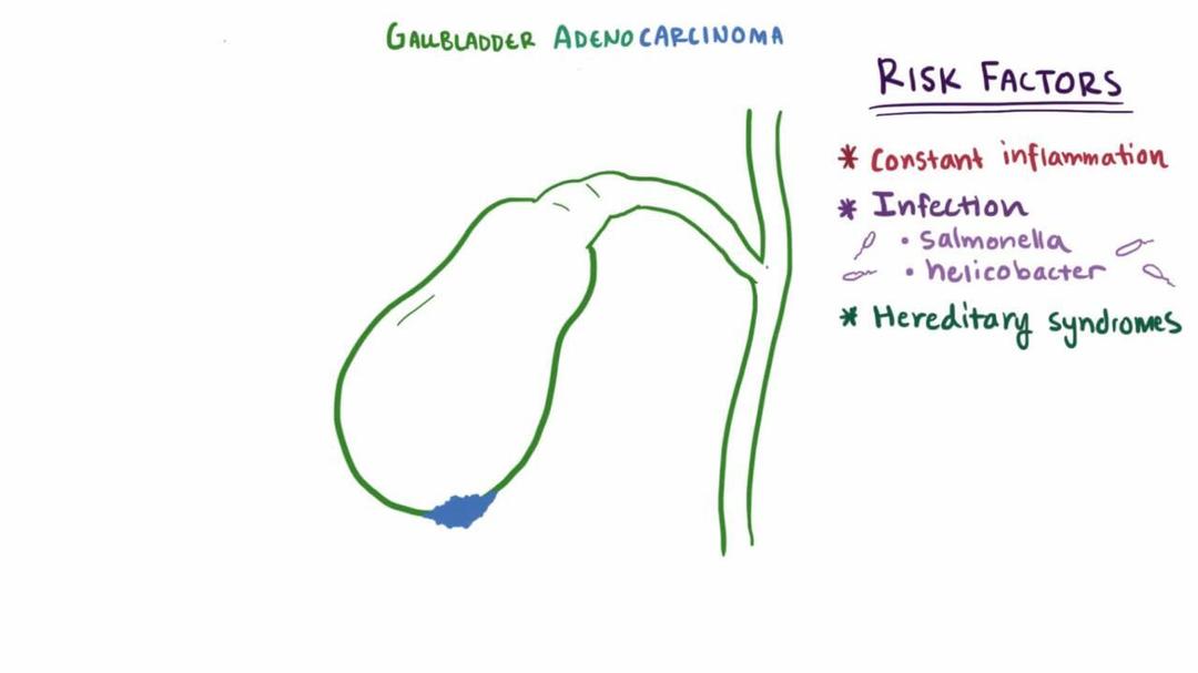 Gallbladder Cancer (Adenocarcinoma) (https://www.youtube.com/watch?v=WsmW6I0cmBE) by Osmosis (https://open.osmosis.org/) is licensed under CC-BY-SA 4.0 (https://creativecommons.org/licenses/by-sa/4.0/).