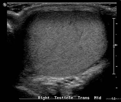 Appropriate testing is done and the result of the imaging study is shown. Which of the following is a correct interpretation of the scrotal ultrasonography?