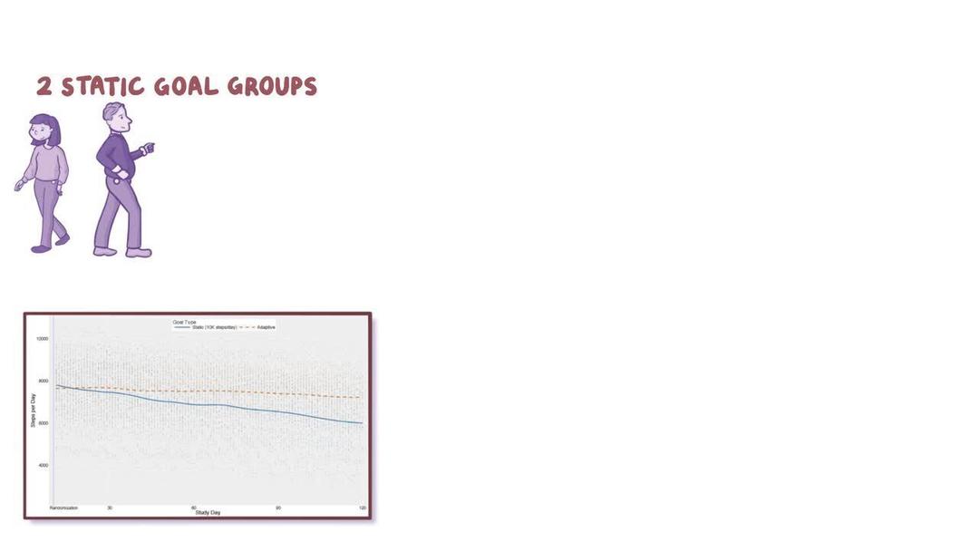 So what happened? Well, on day 11, the two static goal groups, who were told to aim for 10,000 steps per day, increased their steps from a baseline of 7200 steps per day to about 9800 steps per day—an increase of 2600 steps per day. Meanwhile, the two adaptive goal groups who were told to aim for 10,000 steps per day but were given their own daily adaptive goal based on their recent data, increased from a baseline of 7600 steps per day to about 9700 steps per day—an increase of 2100 step per day. The difference between the two groups was not statistically significant. Walking a lot on that one day was great, but then over the next 110 days, all four groups slowly walked less and less. But here’s where it got really interesting. The two adaptive goal groups walked an average of 8 fewer steps per day, whereas the two static goal groups walked an average of 18 fewer steps per day. So that by the end of the study the people in the adaptive groups were walking about 1,000 extra steps per day compared to the people in the static groups.