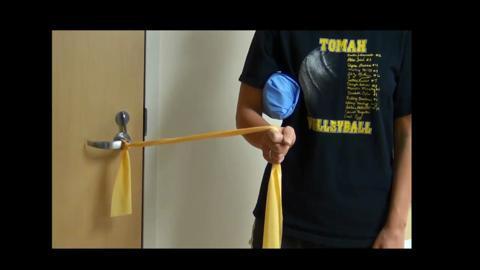 3. Grasp band with involved hand, with elbow bent to 90° and thumb up.